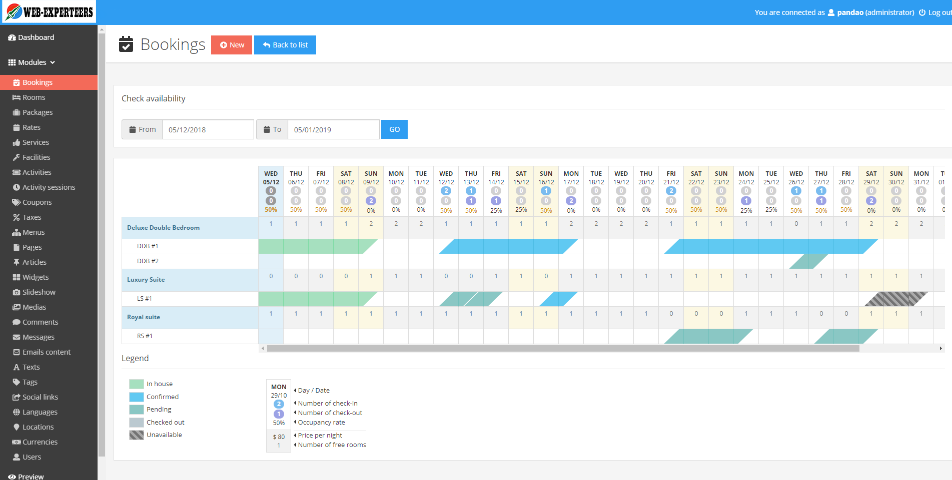 Several new specific modules: bookings, rooms, rates, currencies, extra services and facilities.
