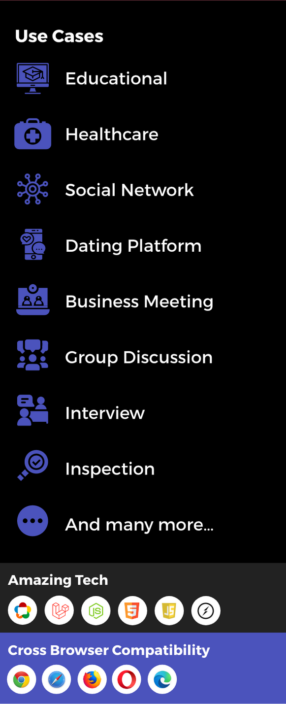 It is used for Online Meetings, Live Classes, Video Chat, Telehealth, Consultation, Education, Dating, Social Media, Business Meetings, Group Discussions, Interviews, and Inspections.